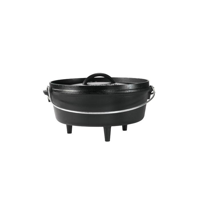The Lodge portable “camp stove” is the pot that does it all. The flanged lid holds hot coals and inverts for use as a griddle. The integral legs allow the oven to sit perfectly over hot coals. The bail handle is for use with a tripod.